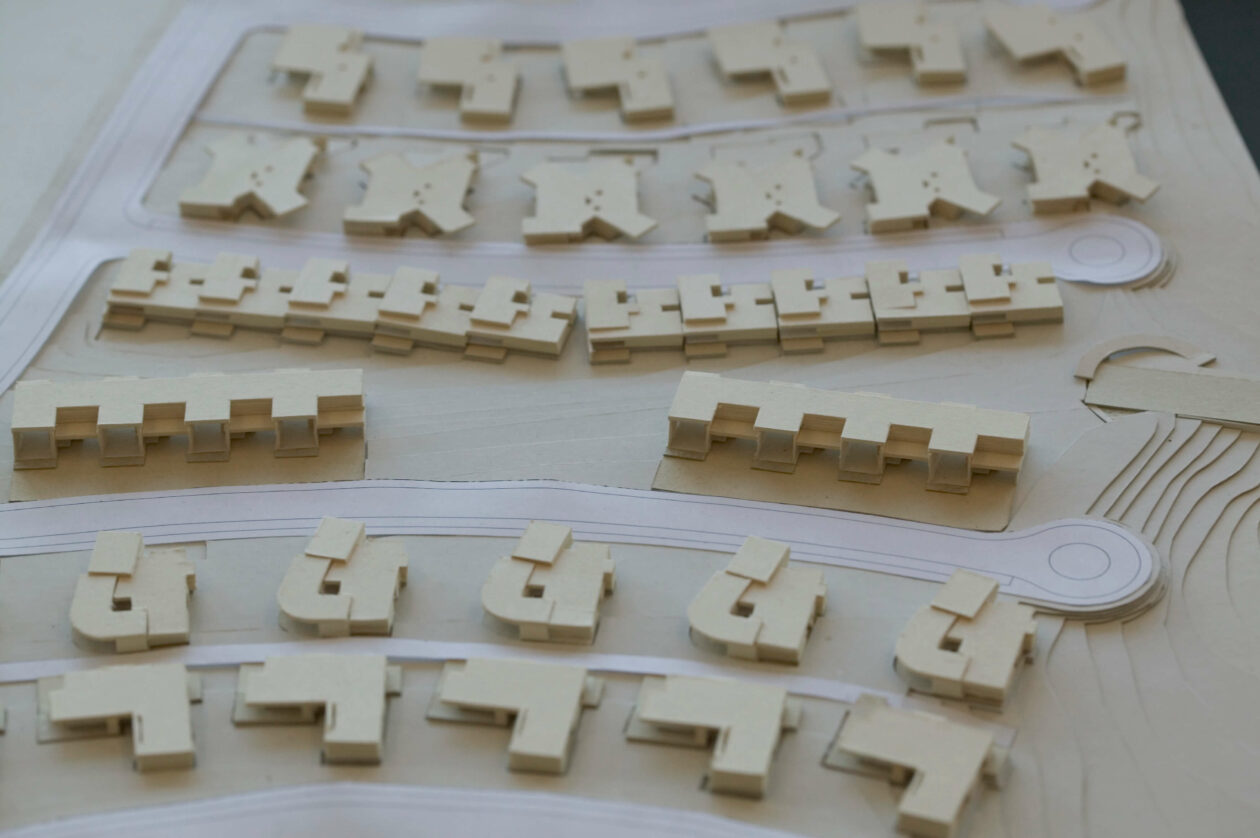 The spatial organization follows a linear plan, with the built volume positioned along the eastern boundary to create a continuous open space parallel to the structure. The entrance, slightly recessed between two angled volumes, leads to a hallway that serves as both a transition zone and an informal gathering space. The living and dining areas, though distinct, are visually connected through a shared courtyard, bringing in natural light and reinforcing the dynamic interplay between interior and exterior.