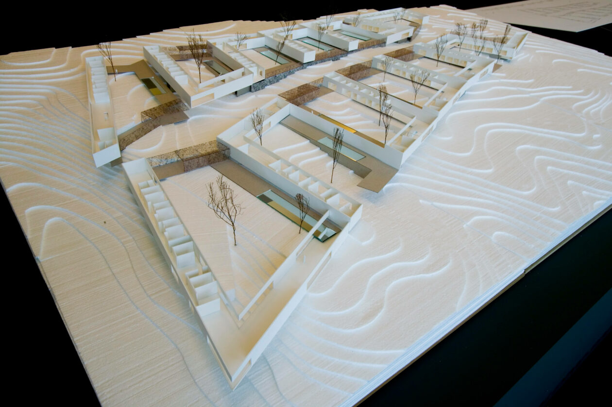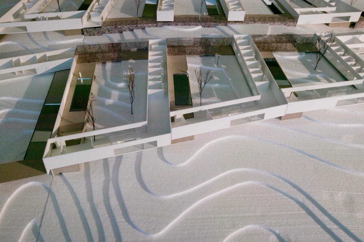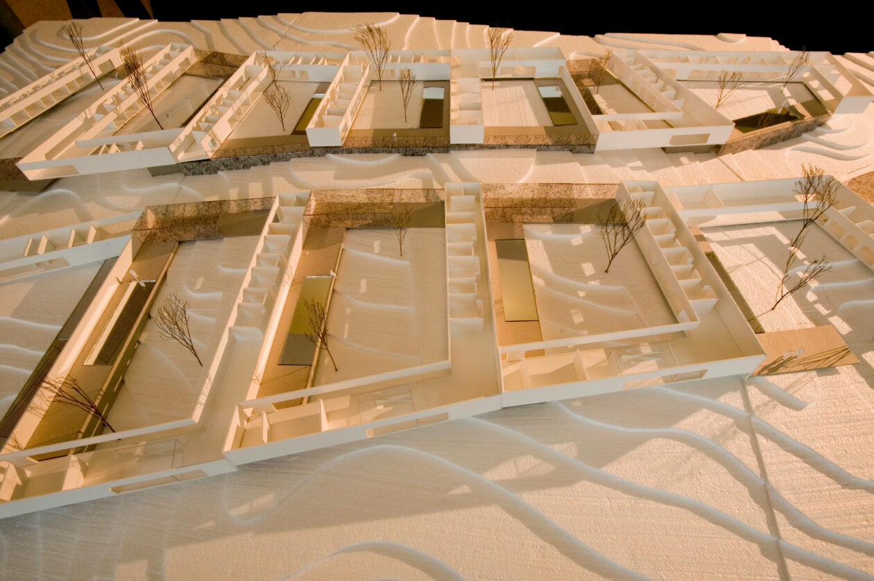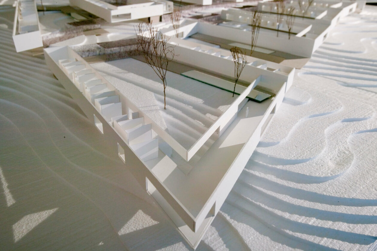 “The concept of building the houses along the site boundary leaves room for large gardens and courtyards, which ensures a high level of privacy for each individual villa. The various living areas are designed around this spacious outdoor area.”