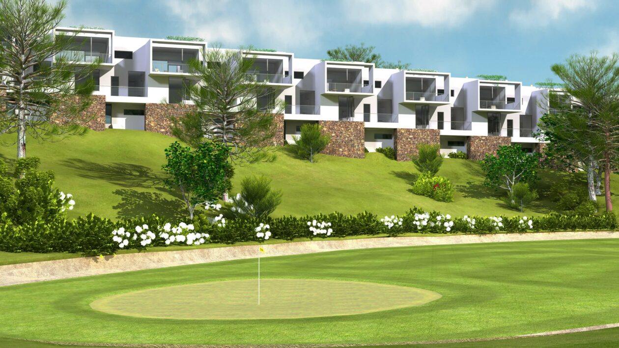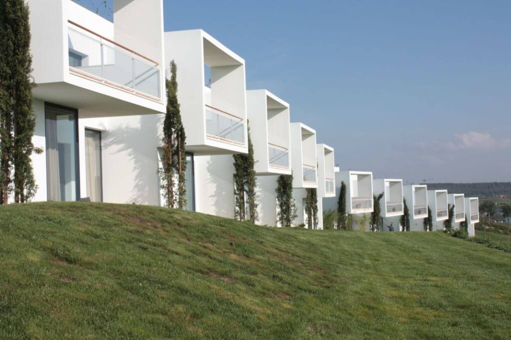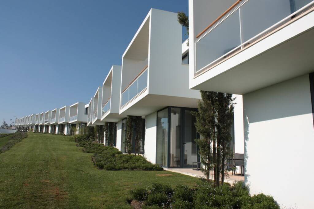 Designed by Gonçalo Cardoso de Menezes, this set of 21 rowhouses on Rua Azul offers panoramic views over golf hole 16 and the forest beyond, with some homes even enjoying distant lagoon views.