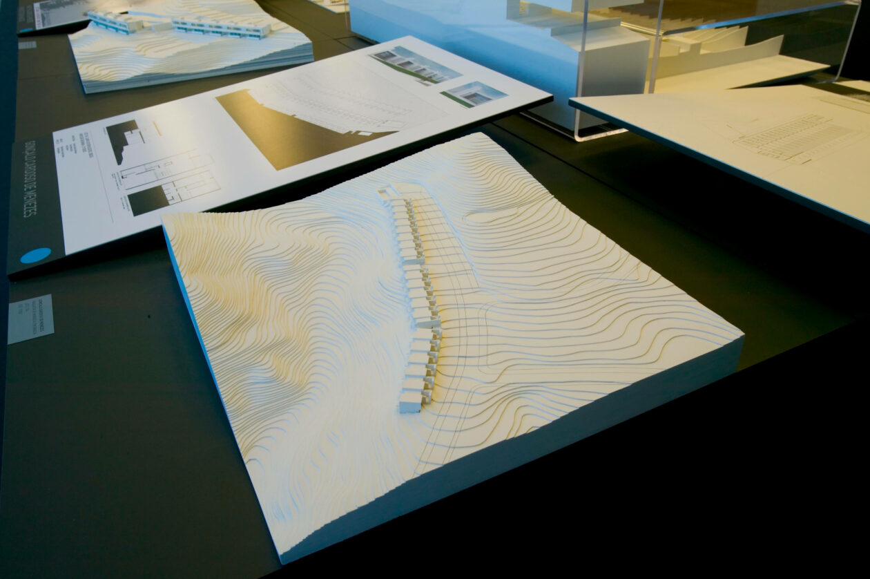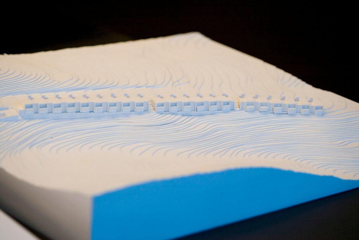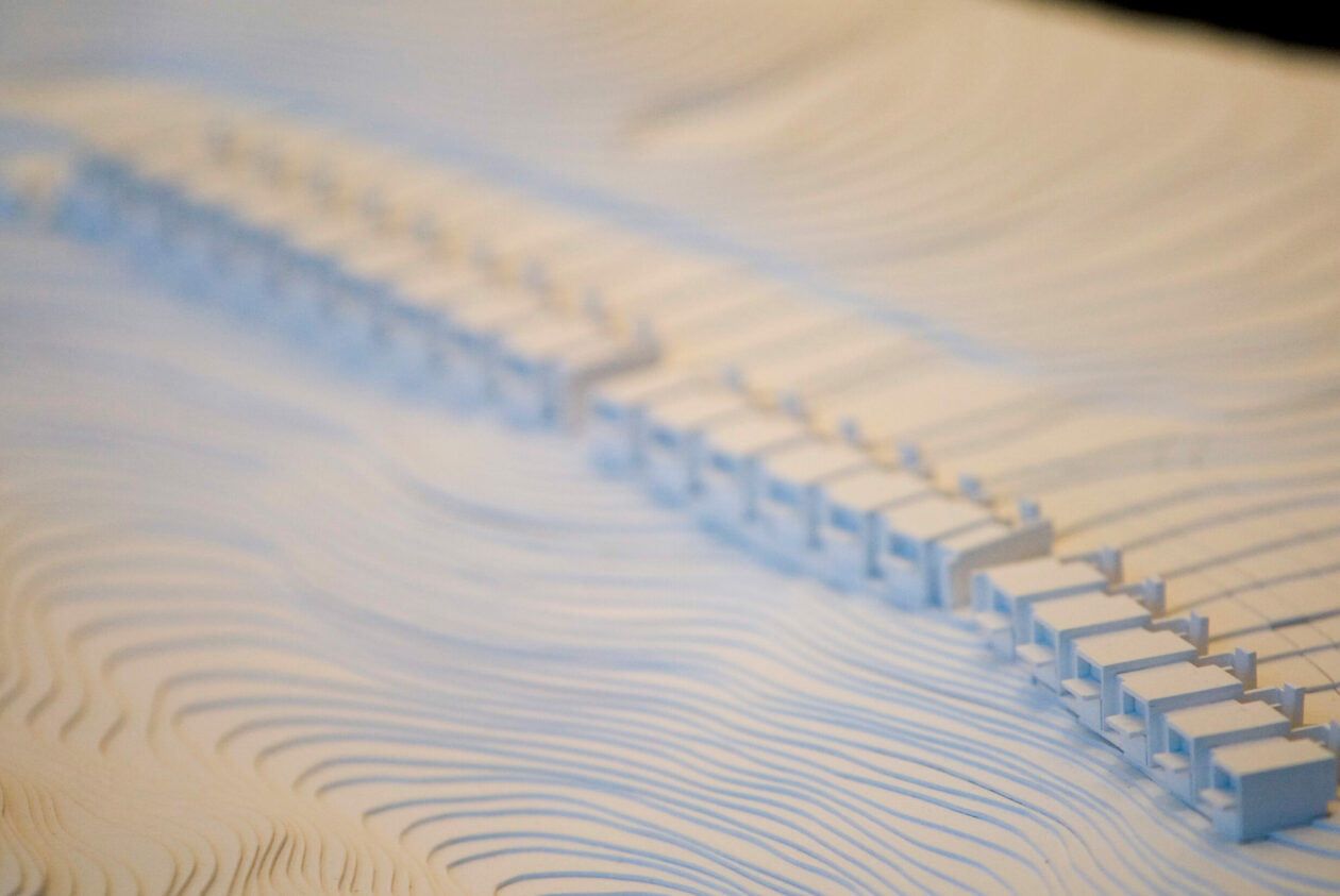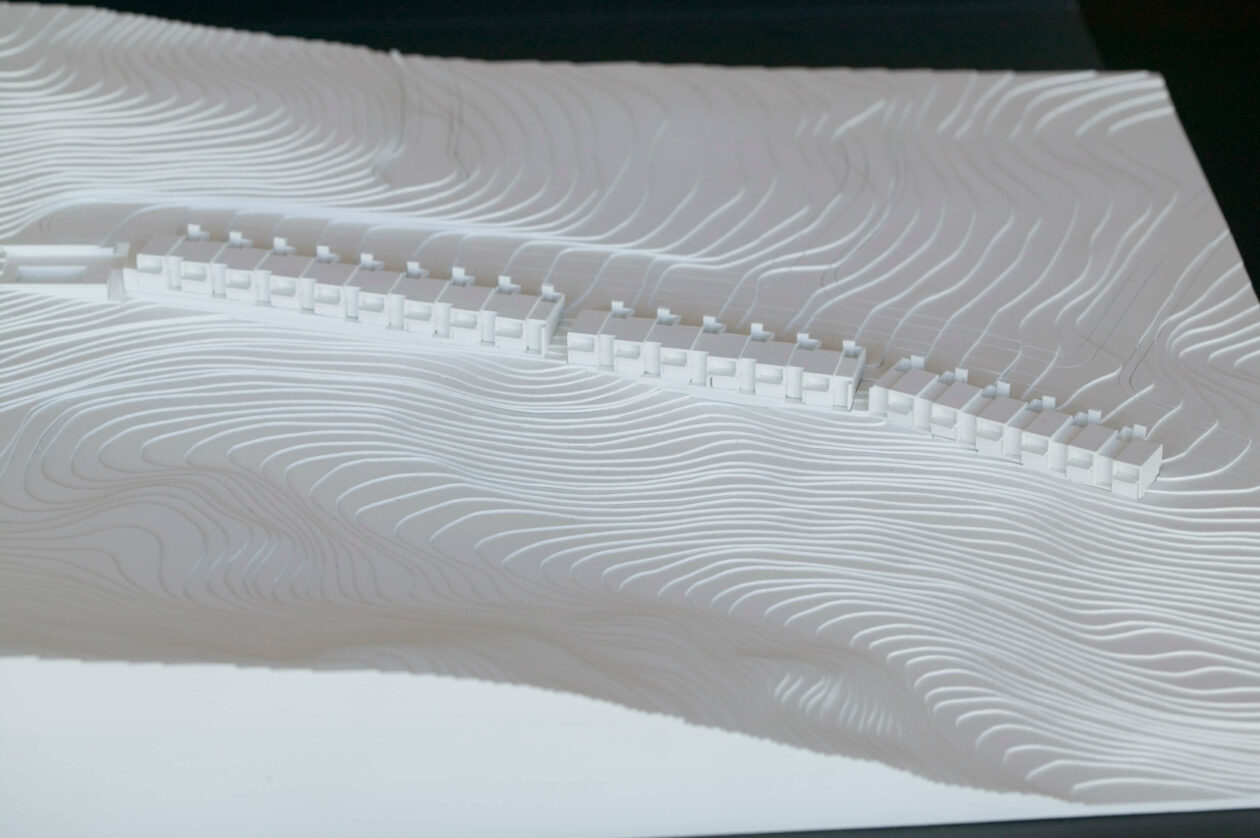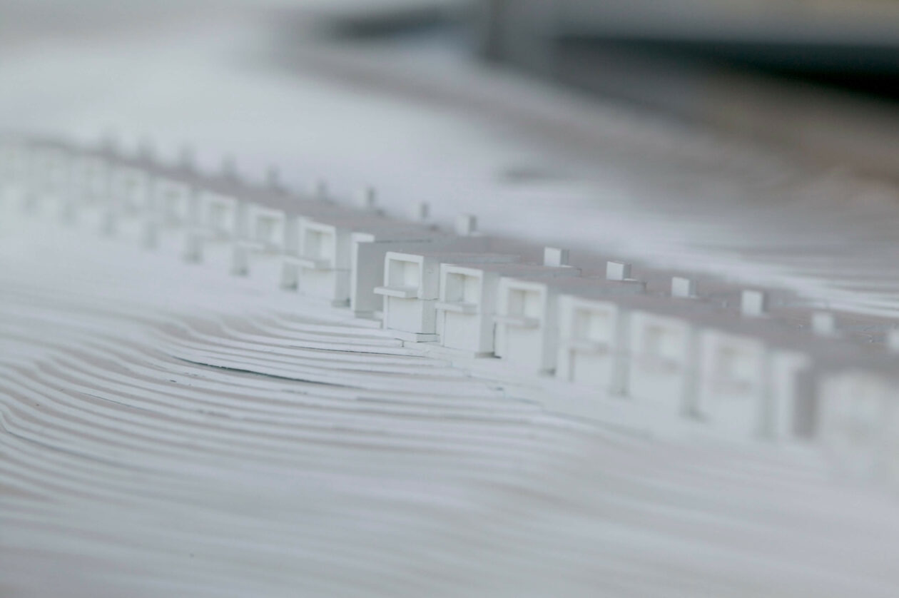 The rowhouses are built along the natural slope of the mountain, adapting their architectural form to the terrain. At the highest point of the development, a shared swimming pool and sun deck provide a relaxing space for families to enjoy while taking in the surrounding views.