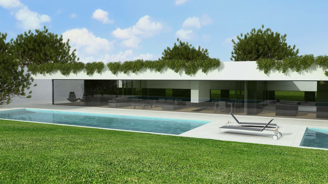 Beyond this transparent living area lies the private garden, which subtly rises into a small hillside, cleverly concealing the garage beneath it. To access the garden and pool, residents cross two bridge-like structures, reinforcing the sense of fluidity and openness. The swimming pool, with its multiple sections, extends across the entire width of the garden, serving as a stunning visual centerpiece.