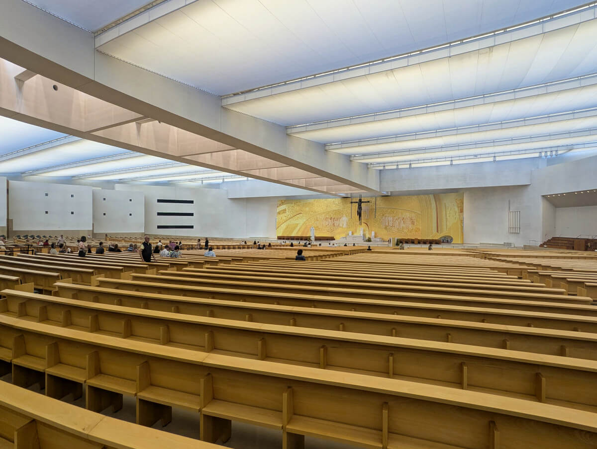 The Church of the Santissima Trindade at the Sanctuary of Fatima, designed by Alexandros Tombazis, is a modern architectural marvel that harmoniously integrates with its historical surroundings. This building serves as a “closing piece” to the religious complex, balancing the overall composition without overshadowing the existing structures. Its design is characterized by a symbiotic relationship with the pre-existing architecture, enhancing rather than neutralizing the site’s spiritual essence. The church’s reserved exterior subtly incorporates religious symbols, reflecting its sacred function. Its unique design is context-specific, making it an integral part of the Sanctuary of Fatima.