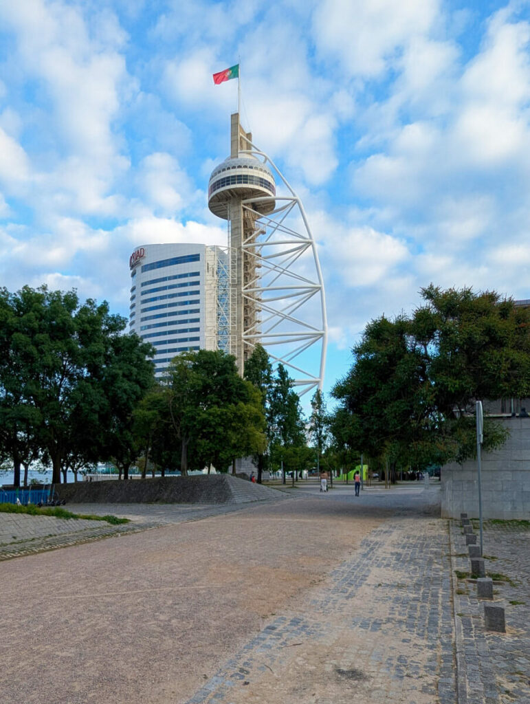 The Vasco da Gama Tower, a striking emblem of Expo ’98, stands as a modern tribute to Portugal’s maritime heritage and the 500th anniversary of Vasco da Gama’s discovery of the sea route to India. Designed by Leonor Janeiro and Nick Jacobs, this 140-meter-high structure is a contemporary architectural marvel located on the banks of the Tagus River in Lisbon. Its design draws inspiration from the sails of ancient ships, with a curved metallic structure that evokes a billowing sail and a wedge-shaped base reminiscent of a ship’s hull. The tower’s vertical concrete beam, reinforced with metal, supports a circular restaurant at its summit, offering panoramic views of the Atlantic Ocean and Lisbon’s metropolitan area. This innovative design not only serves as a counterpoint to the historic Belém Tower but also marks the northern boundary of the exposition site, creating a new urban landmark that seamlessly blends tradition with modernity.