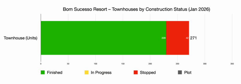 More than 11 years after the collapse of the project, this is a good moment to review the current situation of the resort. This 2026 analysis examines the current state of development at Bom Sucesso Resort, focusing primarily on the progress of villa construction, while also providing a brief overview of the two unfinished sub-condominiums and the stalled hotel project at the beginning.